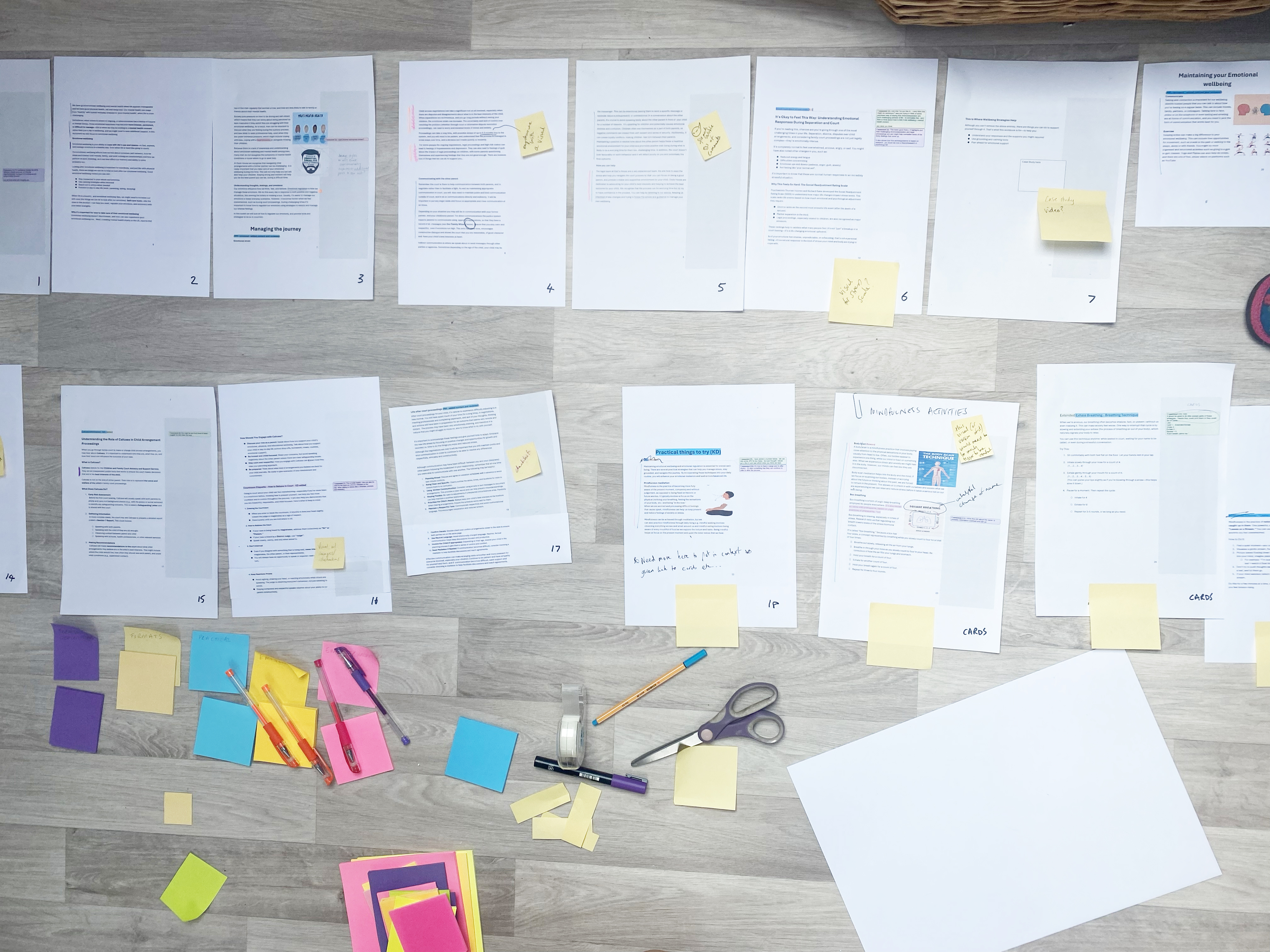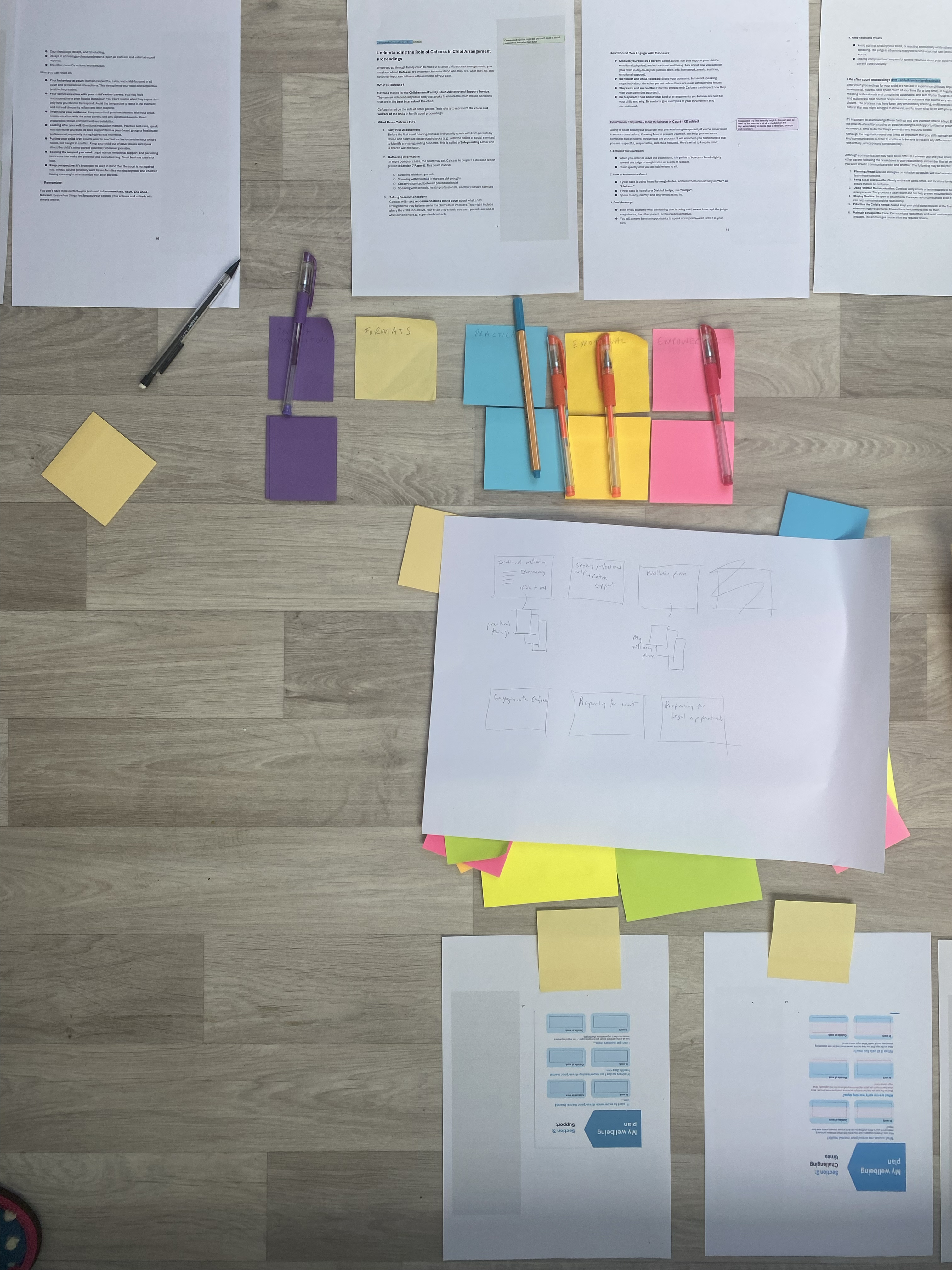 The content was provided to us in a Word document which was dominated by text, but with some images interspersed. The toolkit was set out into sections and spanned 45 pages, it contained a mix of materials; guidance, learning points, practical strategies, thinking points and spaces to reflect and plan. There was also an additional section (15 pages) covering the more practical legal parts of the journey to court and beyond. There were a number of important requirements to keep in mind; inclusive design, production constraints, the realities of use in the environment (e.g. paper may be preferable to online in court) and we need of course to be considerate of the need for future proofing. Dads House are a charity who do not have the funds to plough into multiple revisions.